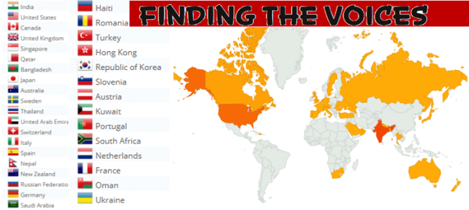 Thank you everyone for viewing and listening to FindingTheVoices. We have crossed 3000 hits and have viewers/listeners from 34 countries.